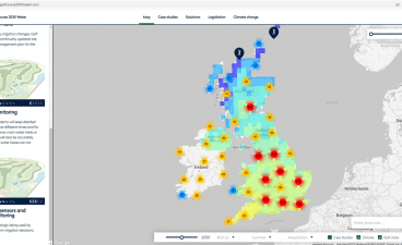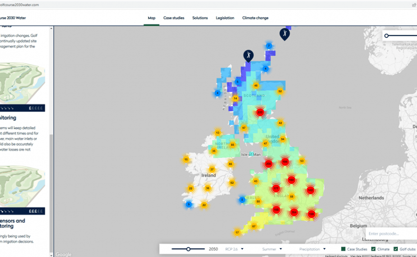The interactive climate change map uses met office data at 60km² intervals with various climate prediction models. This allows the user to see forecasts for a specific area in every season until 2080, with metrics of maximum and minimum temperature as well as average temperature and precipitation. Using this information, clients can see the best and worst-case scenario and allows them to use this data to highlight the risks golf courses will face in the future