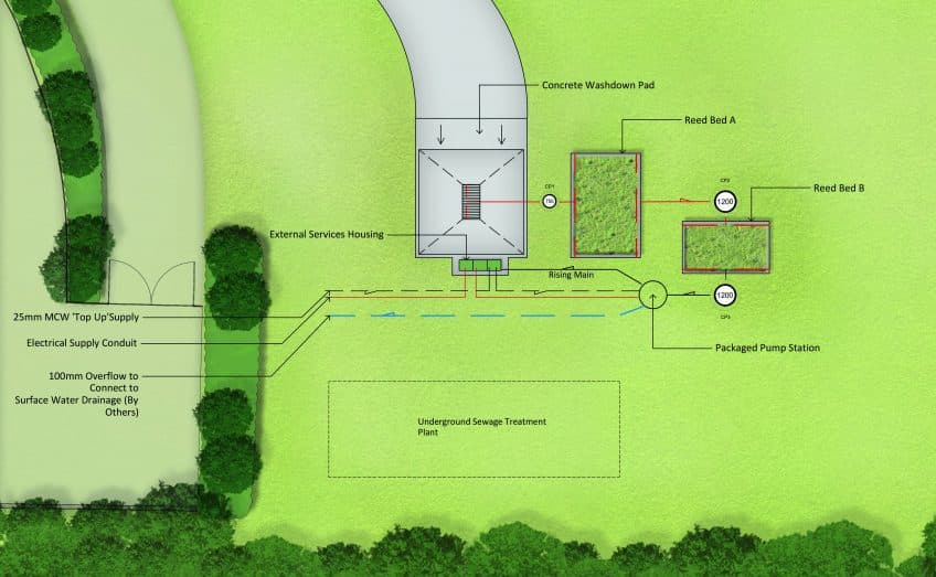 - Perpetually recycling water means that water use is minimal and almost no mains water is used for washdown facility. The only time mains water is used is to top up the water levels of the reed bed in hot weather