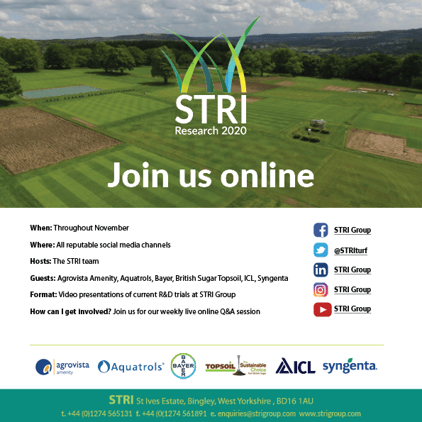 This year’s event is being supported by Agrovista Amenity, Aquatrols, Bayer, British Sugar Topsoil, ICL and Syngenta, and we thank each company for committing time to filming an STRI Research station demonstration with the team at Bingley.